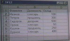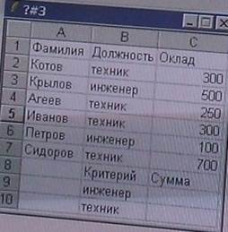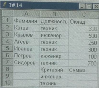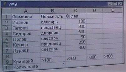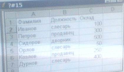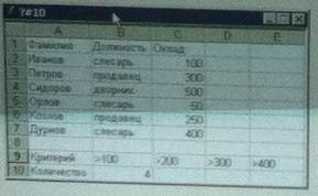 12)Таблица расположена в диапазоне ячеек A1: C7. Для определения количества сотрудников с окладом >100. В ячейку В10 записали и выполнили функцию = СЧЕТЕ СЛИ (диапозон; условие)