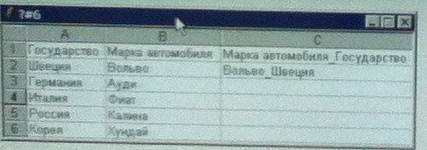 20) в ячейку С2 записана функция объединения Марки автомобиля и Государства в одной ячейке С2. В ответе запишите эту функцию и предусмотрите возможность копирования этой функции во все остальные ячейки столбца С. Ответ: = Сцепить (B2; ”_”; A2)