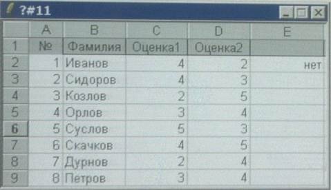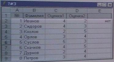 23) В ячейке Е2 записан функция = ЕСЛИ (ИЛИ ((D2 + C2)/2> = 4; И (D2> = 4;C2> = 4));”стипендия”; ”нет”) функция копируется во все ячейки столбца E