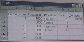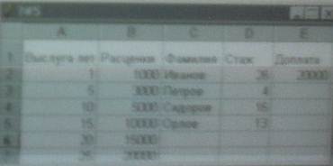 123. На предприятии установлены расценки доплат сотрудникам за выслугу лет: от 1-го года до 4 лет, от 5 до 9 лет и т.д. Требуется определить доплату каждому сотруднику. В ячейку E2 записана функция: = ПРОСМОТР (D2; $A $2: $A $7; $B $2: $B$7). В ответе записать число, которое отобразится в ячейке E5 после копирования функции во все остальные ячейки столбца E.