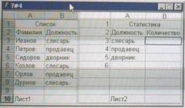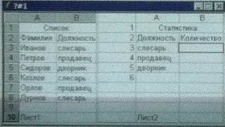 141. Сделали активным Лист 2. В ячейку В3 необходимо записать функцию для определения количества слесарей, то есть функцию = СЧЁТ ЕСЛИ (Диапазон; Условие). Выберите верные варианты записи Условия.