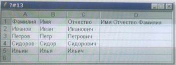 Предусмотреть пробелы между Фамилией, Именем и Отчеством, а также возможность копирования этой функции во все остальные ячейки столбца D