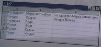 164.В ячейку С2 записана функция объединения Государства и Марки автомобиля в одной ячейке С2. В ответе запишите эту функцию и предусмотрите возможность копирования этой функции во все остальные ячейки столбца С.