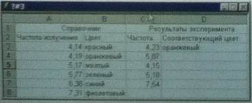 174. Цвета видимого спектра имеют частоты излучения, приведенные в справочнике. Частоты, полученные в результате эксперимента, приведены в столбце С. В ячейку D3 записана функция: = ПРОСМОТР (С3; $A $3: $A $8; $B $3: $B $8), которая определяет, какому цвету соответствует полученная частота. В ответе записать значение, которое отобразится в ячейке D4 после копирования функции во все остальные ячейки столбца D.