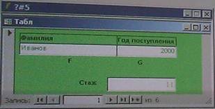 119.На рисунке представлена ФОРМА для одной из таблиц базы данных. В ФОРМУ добавлено вычисляемое поле с надписью Стаж. Название поля таблицы, в котором хранится год поступления на работу – G.