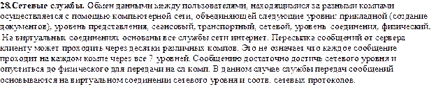 27. Архитектуру компьютерных сетей рассматривают на разных уровнях (общее число уровней — до семи). Самый верхний уровень — прикладной. На этом уровне пользователь взаимодействует с вычислительной системой. Caмый нижний уровень — физический.