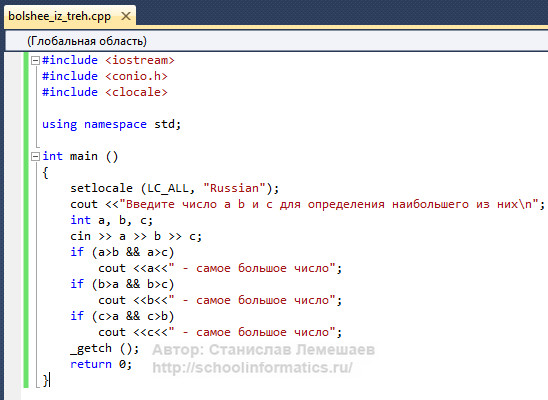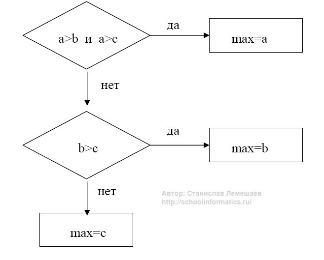 С помощью блок-схемы можно наглядно понять структуру задачи, как она будет работать. Давайте проговорим. Если a>b и a>c, то присвой значение a максимуму иначе если b>c, то b присвой значение максимуму, иначе присвой с максимуму. Затем выводим результат на экран.
