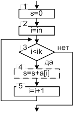 2. в цикле изменяя i от in до ik вычислить суммуэлементов массива по выражениию s=s+ai.