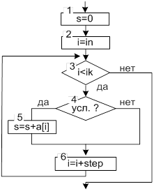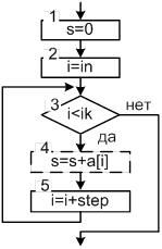 | /* с помощью цикла for */ s=0; for(i=in;i< p=""><> if(условие) s+=a[i]; // или s=s+a[i]; /* с помощью цикла while */ s=0; i=in; while (i<ik)< p=""></ik)<> { if(условие) s+=a[i]; i=i+step; } |