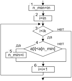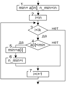 1. в качестве начального значения переменной min выберем любой из рассматриваемых элементов (обычно выбирают первый). Тогда min=ain, n_min= in;