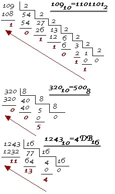 В общем случае для перевода целой части числа из десятичной системы счисления в систему с каким-либо другим основанием необходимо: