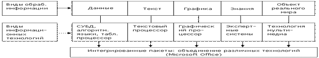 5.Понятие информационных технологий: определение, основные принципы и инструментарий Процессы преобраз. информации связаны с информационными техн-ями. Техн-я в переводе с греческого - искусство, умение, а это не что иное как процесс. Процесс - определенная совокупность действий, направленных на достижение поставленных целей. Техн-я материального производства определяется как совокупность методов обработки, изготовления, изменения состояния, свойств, формы сырья, материала или полуфабриката в процессе производства Цель технологии материального производства - выпуск продукции, удовлетворяющей потребности человека или системы. ИТ - система взаимосвязанных методов и способов сбора, хранения, накопления, поиска, обработки информации на основе применения средств вычислительной техники. Цель ИТ - производство информации для анализа человеком и принятие на его основе решения по выполнению какого-либо действия (управленческого решения). Особенностью ИТ является то, что в ней и предметом и продуктом труда является инф., а орудиями труда - средства вычислительной техники и связи. Основные принципы компьютерных (новых) информационных технологий: интерактивный режим (диалоговый или режим реального времени) работы с ПК;интегрированность (стыковка);гибкость процесса изменения как данных, так и постановок задач. Инструментарий ИТ - один или несколько взаимосвязанных программных продуктов для определенного типа компьютера, техн-я работы в котором позволяет достичь поставленную пользователем цель (текстовый процессор (редактор), настольные издательские системы, электронные таблицы, системы управления базами данных, электронные записные книжки, электронные календари, информационные системы функционального назначения (финансовые, бухгалтерские, для маркетинга и пр.), экспертные системы и т.д. Требования к ИТ: малая стоимость, находящаяся в пределах доступности для индивидуального покупателя; автономность в эксплуатации без специальных требований к условиям окружающей среды; гибкость архитектуры, обеспечивающая ее адаптивность к разнообразным сферам применения: в управлении, науке, образовании, в быту;"дружественность" операционной системы и прочего прогр.обеспечения, обусловливающая работу с ней пользователя без специальной профессиональной подготовки; высокая надежность работы (более 8000 часов наработки на отказ).