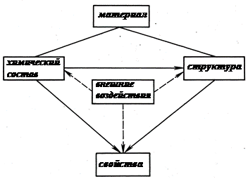Материаловедение – это наука, изучающая связь между химическим составом, структурой и свойствами материалов и закономерности изменения этих свойств под влиянием внешних воздействий ( механических,термических, химических и др.), реализуемых в процессе производства, обработки и эксплуатации изделий из этих материалов (см. рис. 1).