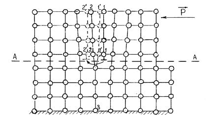 Рис. 1.2.8. Начальный этап эстафетного перемещения краевой дислокации (^): А-А – плоскость скольжения, 1-1 экстраплоскость (исходная позиция)