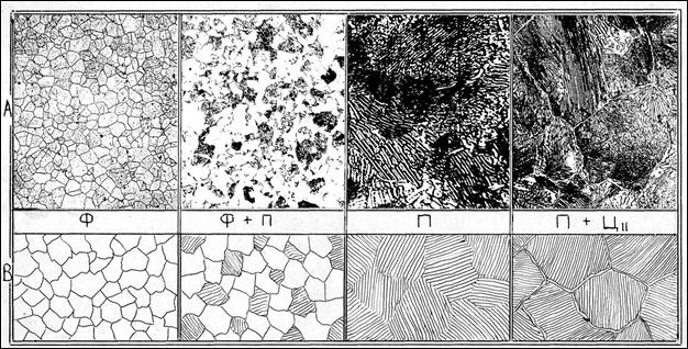 Заметим, что несмотря на разнообразие структур[12], (обусловленное тем, что сплавы с разным содержанием углерода пересекают при охлаждении различные линии диаграммы Fe –Ц), фазовый состав сплавов, содержащих >0,01%С, одинаков – Ф + Ц.