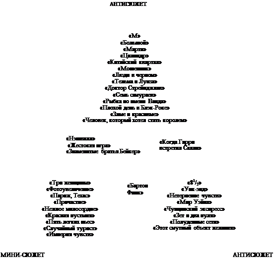Такой фильм, как «Бартон Финк» (Barton Fink), может быть помещен в самый центр треугольника, поскольку вобрал в себя качества, характерные для каждого из его углов. Он начинается с истории молодого драматурга из Нью-Йорка (единственный главный герой), который пытается «оставить свой след» в Голливуде (активный конфликт с внешними силами) — архисюжет. Однако Финк (Джон Туртурро) начинает чуждаться общества и испытывает трудности как писатель (внутренний конфликт) — мини-сюжет. Постепенно это состояние переходит в тихое безумие, и мы все меньше понимаем, что является реальностью, а что фантазией (непостоянная реальность), а в один из моментов уже ничему не можем доверять (разорванная временная и причинная последовательность) — это антисюжет. Концовка фильма, когда Финк смотрит на море, носит достаточно открытый характер, но нет сомнения, что он уже никогда не будет писать что-либо в этом городе.
