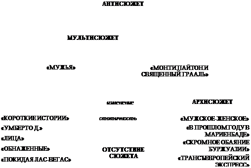 Антиструктурные бессюжетные фильмы также следуют циклической модели, но изменяют ее за счет абсурдности и сатиры, которые представлены в излишне ненатуралистичном стиле. В таких фильмах, как «Мужское-женское» (Masculine Feminine), «Скромное обаяние буржуазии» (Discreet Charm of Bourgeoisie) и «Призрак свободы» (Phantom of Liberty), связаны воедино сцены, высмеивающие сексуальные и политические шалости буржуазии, однако слепые дураки, показанные в самом начале, остаются столь же слепыми и глупыми вплоть до заключительных титров.