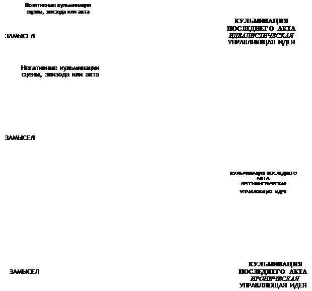 Позитивные и негативные утверждения одной и той же идеи вступают в противоборство на протяжении всего фильма, пока в критический момент не сталкиваются лицом к лицу в последней битве. Тогда возникает кульминация, в которой должна победить та или иная идея. Это может быть позитивная идея «Справедливость торжествует, потому что главный герой очень находчив и смел» — «Плохой день в Блэк-Роке» (Bad Day at Black Rock), «Скорость» (Speed), «Молчание ягнят» (The Silence of the Lambs), — или негативная контридея «Несправедливость побеждает, потому что соперник невероятно жесток и могущественен» — «Семь» (Seven), «Q & A» (Q & А), «Китайский квартал» (Chinatown). То, что воплощено в финальном кульминационном действии, становится управляющей идеей и бесспорным утверждением безусловного и окончательного смысла истории.