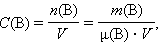 Молярная концентрация вещества B в растворе C (B) – содержание количества растворенного вещества B в единице объема раствора, моль/м3, или чаще моль/литр: