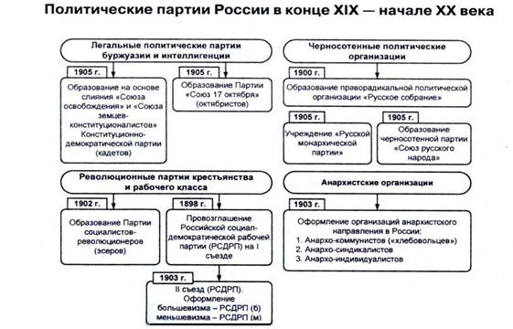 Вывод: в России в начале XX в. существовал широкий спектр политических партий. Особенностью является то, что их деятельность всячески тормозилась самодержавным политическим режимом. Это предопределило оппозиционный характер большинства партий, слабость политического центра, тенденцию к все большей поляризации и радикализации общественно-политических сил.
