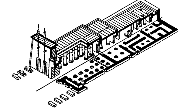 Заупокойные храмы при гробницах строились по одному плану. Это были вытянутые по одной линии помещения, следующие друг за другом. Вход в храм фланкировался двумя башнями — пилонами. Сначала верующие попадали во двор — перистиль (обнесенный по периметру колоннами), затем во второй двор — гипостиль (сплошь заставленный колоннами). За двором-гипостилем следовало святилище, в котором находилась статуя божества. За святилищем помещалось хранилище, в котором находилась казна храма и скрипторий, т. е. собрание свитков папируса со священными текстами.