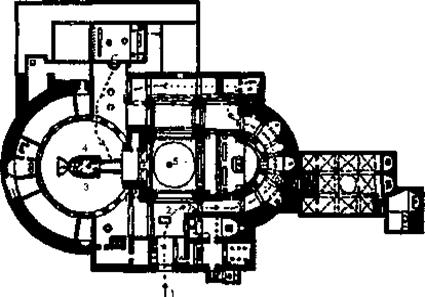План храма Гроба Господня:1- вход;2- камень помазания;3- ротонда; 4- часовня Гроба Господня; 5- каменная ваза «центр земли»;6- вход в подземный храм Св. Елены; 7- лестница на Голгофу.