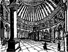 Две большие бронзовые колонны стояли по сторонам инкрустированных золотом дверей, сделанных из оливкового дерева. Бронзовые сосуды, установленные на основаниях с колесами, предназначались для омовения сжигаемых жертвоприношений. Ступеньки в глубине здания вели в „Святая святых" — помещение, где находился ковчег Завета; в нем хранились каменные таблички с записанными на них десятью заповедями».*