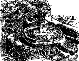 критского, оно более суровое и простое. Жители городов Микен и Тиринфа строили свои города-крепости на высоких холмах, укрепляя их стенами. Отсюда и появилось название «акрополь» — верхний город. Стены Микен длиной в 900 м имеют толщину от 6 до 10 м, а Тиринфа — 17,5 м, сложены из каменных глыб весом в 5—6 т. Планировка микенских дворцов-акрополей существенно отличается от принятой на Крите. Дело не только в крепостной стене и воинственном духе сооружений. Их ясное и четкое построение имело очень мало общего со сложными и запутанными критскими дворцами. Основу микенского дворца составляло длинное прямоугольное здание.