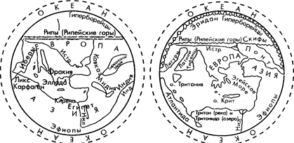 Карты земли Гесиода. Около 700 г. до н. э. (слева) и Гекатея Около 600 г. до н. э. (справа)