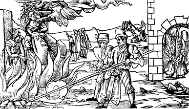 Сожжение женщин, обвиненных в колдовстве. Гравюра из германского памфлета. 1555 г.