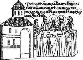 Князь угощает митрополита и его причт. Миниатюра из «Жития св. мучеников Бориса и Глеба».XIV в.