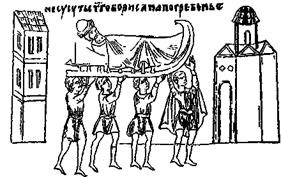 Погребение князя. Миниатюра из «Жития св. мученников Бориса и Глеба». XIV в.