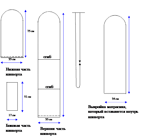 В сложенном состоянии конверт имеет длину 75 см и ширину 35 см. Его можно пошить из тонкой хлопчатобумажной ткани не только белого, но и любого другого цвета – розового, голубого, бледно-желтого и т.д. Внутрь через оставленный разрез вкладывают одеяльце, которое можно пошить из нескольких слоев хлопчатобумажной ткани, либо выстегать на ватине, либо положить простое одеяльце, сложенное до нужного размера.