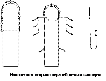 Верхнюю и нижнюю детали конверта складывают лицевыми сторонами вовнутрь (внутри располагаются и боковые детали и оборки). Сгибают верхнюю деталь конверта так, чтобы совместить обработанные срезы верхней и нижней деталей встык, лицевой стороной вовнутрь. По краям нижнего сгиба верхней детали конверта поместите вовнутрь две завязки так, чтобы кончики лент выступали на 0,5 см от края. И еще аналогично две завязки - у верхних краев боковых частей (смотрите рисунок). Сострочите детали. Сделайте надсечки на закругленной части. Выверните через образовавшееся отверстие, расправьте швы и проутюжьте.