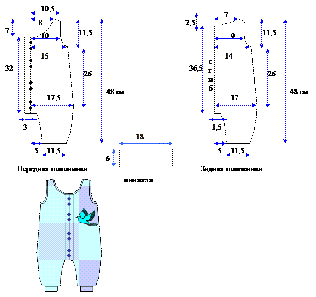 При раскрое полукомбинезона добавьте припуски на швы по 0,5 см, по 1см по окату рукава и горловине, и 3 см для цельнокроеной планки по середине передней части.