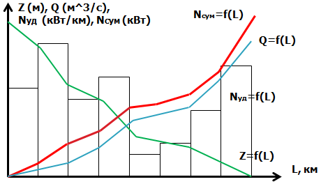 8. Построить кадастровый график, т.е. графическое представление гидроэнергетических ресурсов реки Z=f(L), Q=f(L), Nуд=f(L), N∑=f(L) (рис. 1.2);