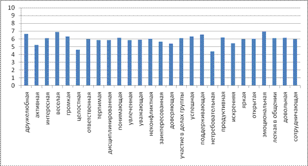 Рассмотрим содержание представлений студентов о собственной группе «1 курс», они содержат следующие характеристики: эмоциональная(6,94±0,2), веселая (6,89±0,2), дружелюбная (6,65±0,2), поддерживающая (6,56±0,2), громкая (6,32±0,3), успешная (6,32±0,2), продуктивная (6,18±0,2), понимающая (6,15±0,2), довольная (6,13±0,2), участие в делах группы (6,11±0,3), легкая в общении (6,11±0,3), интересная(6,11±0,3), открытая (6,01±0,3), неконфликтная (5,99±0,2), яркая(5,98±0,3), ответственная (5,98±0,2), сотрудничающая (5,97±0,3), дисциплинированная (5,90±0,2), уважающая (5,89±0,2), терпимая(5,87±0,2), увлеченная (5,86±0,2), заинтересованная (5,66±0,2), искренняя (5,45±0,2), доверяющая (5,37±0,2), активная (5,22±0,9), разрозненная (4,59±0,3), требовательная (4,41±0,2).