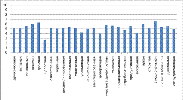 Члены группы оценивают ее как довольную, унылую, тихую и неинтересную, тусклая, что говорит о том, что группа не «звездит» среди других групп, и вся эмоциональность остается внутри группы.