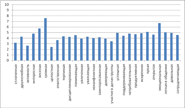 Наиболее выраженный показатель в данной группе – успешная; студенты позиционируют свою группу как максимально успешную в учебном плане, это так же подтверждают характеристики группы продуктивная и конкурирующая, значит они прикладывают усилия для достижения успеха.