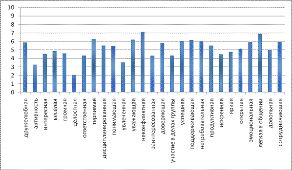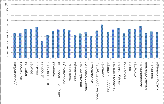 Рассмотрим содержание представлений студентов о собственной группе студентов «5 курс»: неконфликтная (7,14±0,3), легкая в общении (6,91±0,3), терпимая(6,27±0,3), уважающая (6,21±0,3), поддерживающая (6,16±0,3), нетребовательная (6,04±0,3), успешная (6,02±0,3), сотрудничающая (5,94±0,4), эмоциональная (5,92±0,4), дружелюбная (5,88±0,3), доверяющая(5,79±0,5), дисциплинированная (5,51±0,4), продуктивная(5,51±0,3), понимающая (5,49±0,3), открытая (5,14±0,5), довольная (5,05±0,3), унылая (4,87±0,3), тихая (4,58±0,3), неинтересная (4,53±0,4), неискренняя (4,49±0,4), безответственная (4,35±0,4), незаинтересованная (4,34±0,5), безучастная (4,32±0,4), равнодушная (3,52±0,3), пассивная (3,26±0,3), разрозненная (2,05±0,4), тусклая (4,77±0,4).