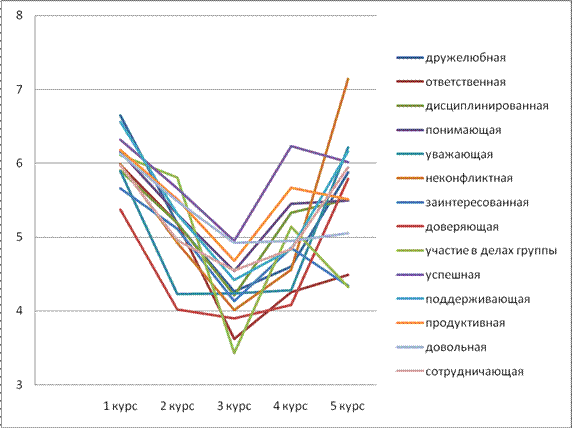 Рис.2.2.7. Динамика представлений студентов разных курсов о собственной группе, с максимальной выраженностью на 1 курсе, минимальной – на 5 курсе.