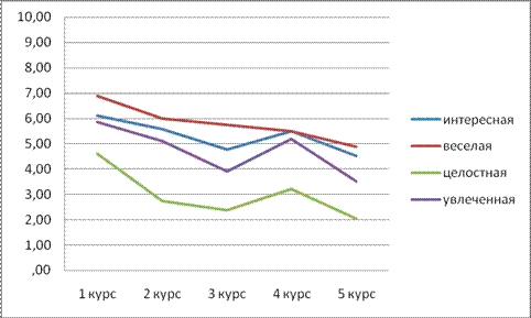 В группе 4 курса на высоких позициях остаются показатели эмоциональная, громкая, интересная, веселая, открытая, яркая, т.о. можно считать, что именно эти характеристики являются доминирующими на всей протяженности обучения в ВУЗе.