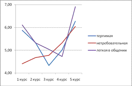 Характерные оценки собственной учебной группы в начале обучения находятся на высоком уровне, но к третьему курсу показатели снижаются, что свидетельствует, по мнению большинства авторов, о кризисе профессионального самоопределения, который не лучшим образом влияет на оценку представлений. Эта динамика представлена на рисунке 2.2.6.