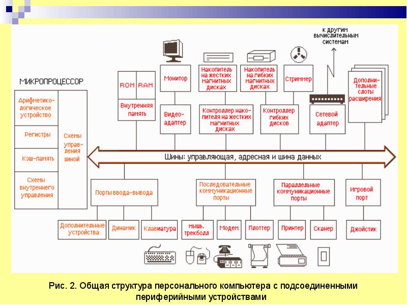 Рис. 1. Общая структура персонального компьютера с подсоединенными периферийными устройствами