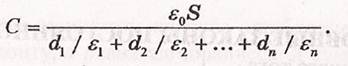 Электрическая емкость плоского конденсатора, заполненного п слоями диэлектрика толщиной dj каждый с диэлектрическими проницаемостями в, (слоистый конденсатор)