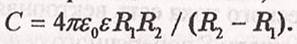 · Электрическая емкость сферического конденсатора (две концентрические сферы радиусами R1 и R2, пространство между которыми заполнено диэлектриком с диэлектрической проницаемостью Ɛ)