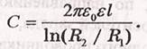 · Электрическая емкость цилиндрического конденсатора (два коаксиальных цилиндра длиной l и радиусами R1 и R2, пространство между которыми заполнено диэлектриком с диэлектрической проницаемостью Ɛ)