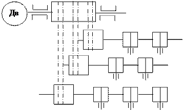 Вследствие своего технического несовершенства такой электропривод в настоящее время практически не применяется и представляет интерес лишь с точки зрения истории развития электропривода.Однодвигательный электропривод представляет собой систему, когда каждая рабочая машина приводится в движение отдельным, связанным только с ней электродвигателем, как изображено на следующем рисунке.