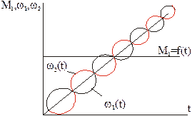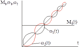 Видно, что переходные процессы в среднем протекают равномерно ускорено, однако мгновенные значения w1 и w2 при этом не совпадают, т.к. содержат колебательные составляющие, причем колебания совершаются в противофазе.