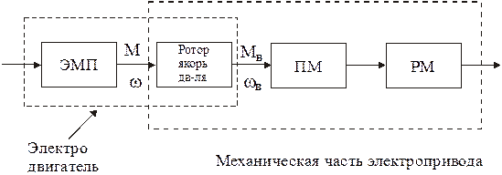 Основным элементом электромеханической системы является электродвигатель. Его можно представить состоящим из механической части (ротора или якоря, обладающих инерцией) являющейся механическим звеном, и электрической, в которой происходит электромеханическое преобразование энергии. Эту часть сокращенно называют ЭМП – электромеханический преобразователь энергии. ЭМП можно рассматривать как идеализированный двигатель, ротор (якорь) которого не обладает механической энерцией и не имеет механических потерь. К такому ротору приложен развиваемый ЭМП при скорости w электромагнитный момент М двигателя.